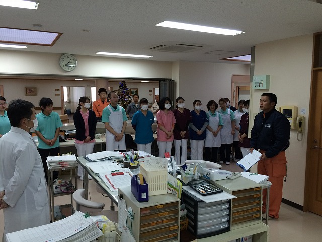 東病院では、平成26年度第2回消防訓練(避難、通報、消火)を上球磨消防署の指導、監督のもと夜間を想定して行いました。